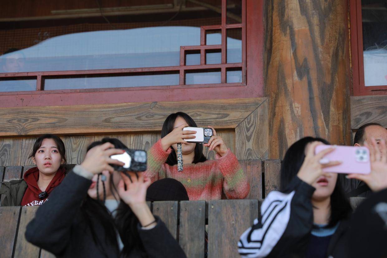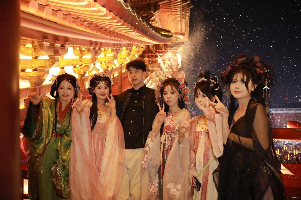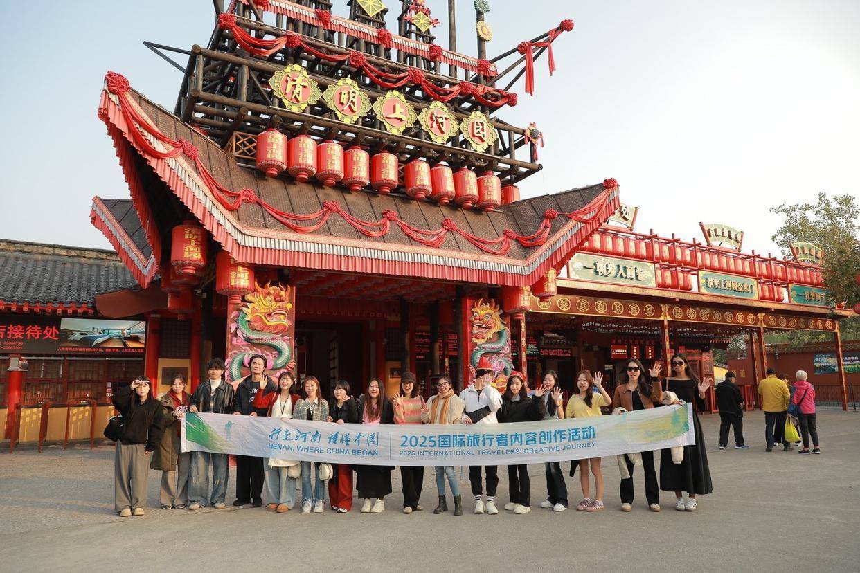 图为达人们在龙门石窟合影留念。在洛阳,达人们身着汉服漫步在天堂、明堂与九洲池,在镜头里定格古都的浪漫。夜幕降临,沉浸式演艺《唐宫乐宴》让他们梦回千年前的隋唐宫宴,流光溢彩间尽显东方美学的极致魅力。从龙门石窟的佛光石影到洛邑古城的灯火璀璨,洛阳以厚重的历史与崭新的文旅融合体验诠释着“古都不老,风华常新”。韩国籍达人李彩恩(LEE CHAEEUN)感叹道:“洛阳带给我一段穿越时空的旅程,汉服体验、沉浸式演出,洛阳让唐朝文化‘火’起来,也‘活’起来。”开封:宋韵长流,烟火依旧