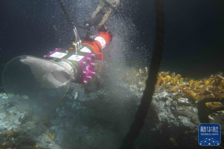 ↑9月18日,采火装置在海底冷泉喷口采集可燃冰。(广州海洋地质调查局供图,张亚念摄)