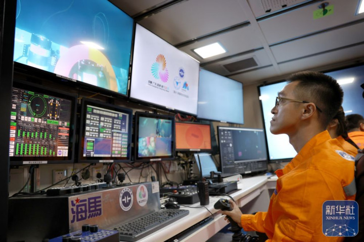 9月18日,在科考船上的“海马”号深海遥控潜水器控制室里,工作人员遥控采火装置在海底进行作业。新华社记者 卢汉欣 摄