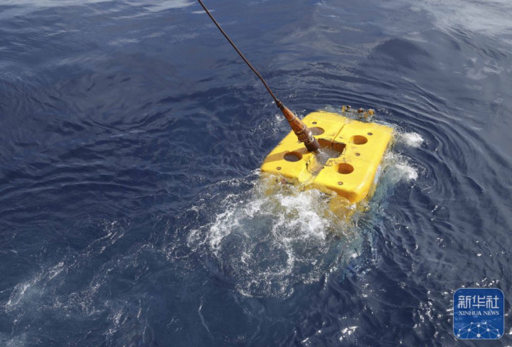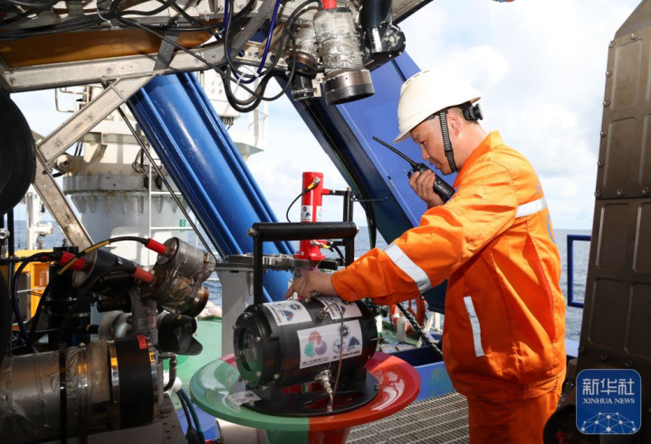 ↑9月18日,“海马”号深海遥控潜水器搭载着采火装置下水采集“源火”。新华社记者 卢汉欣 摄